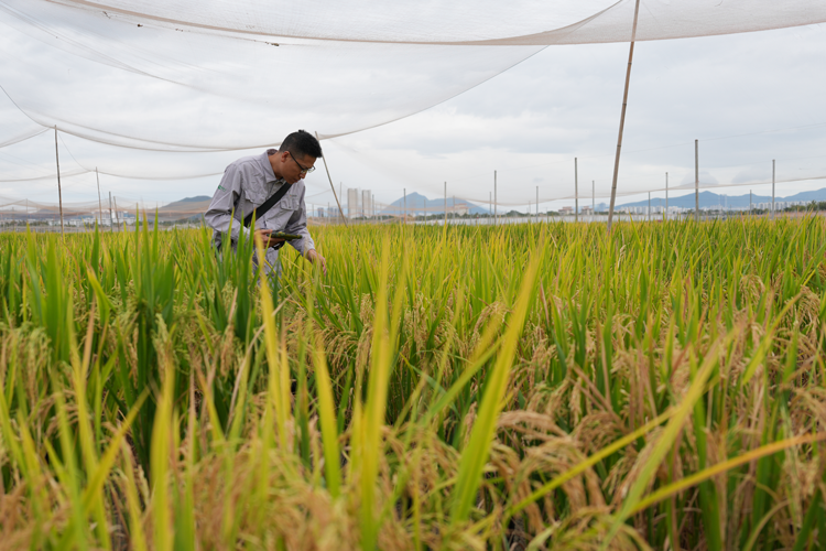海南省三亚市崖州湾科技城,中国种业的“南繁硅谷”。一块块育种试验田,或金黄,或青绿,凹凸交织,乱中有序。